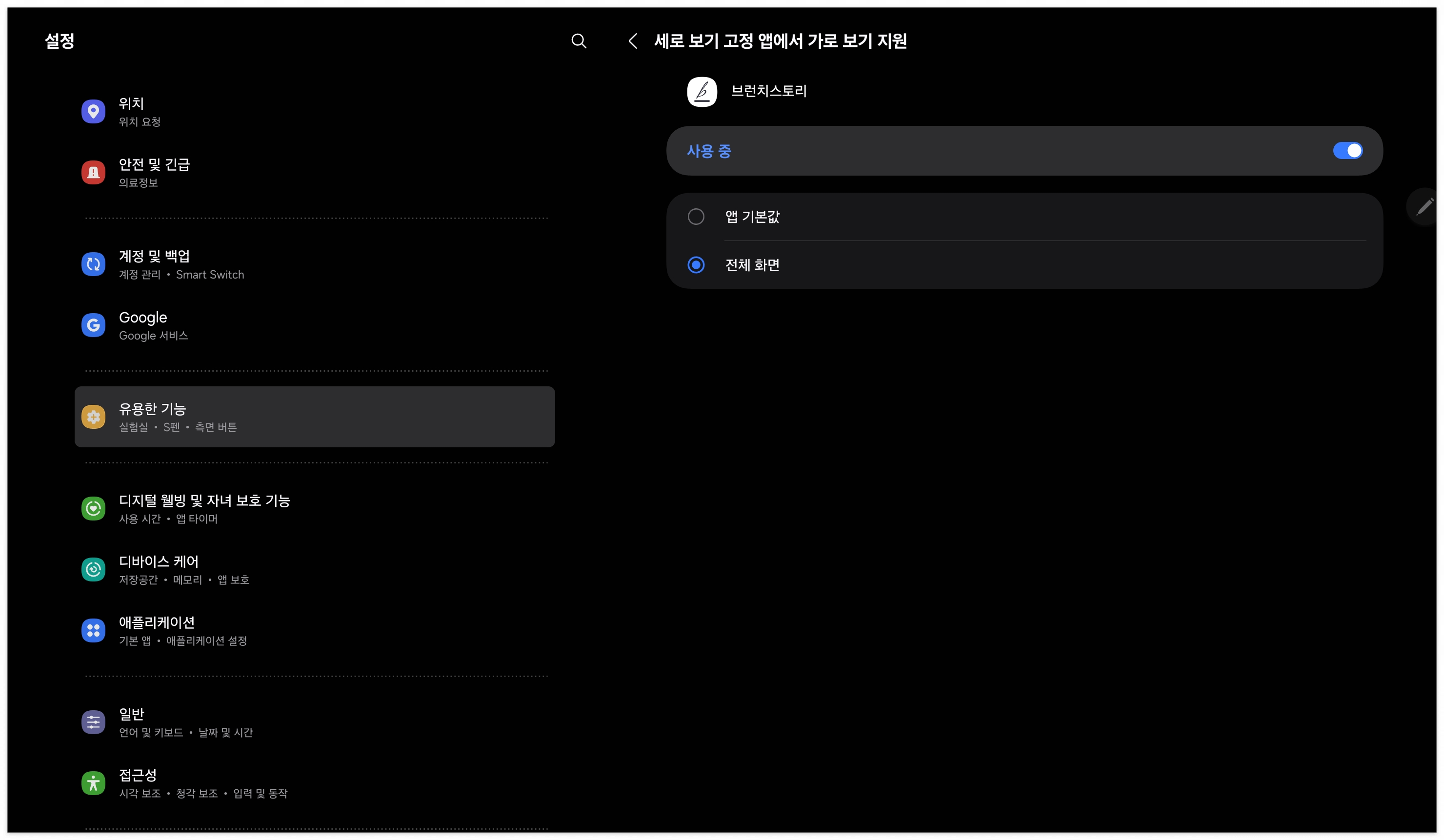 **해당 기능 업데이트 되어, 설정 -> 애플리케이션 -> 내가 사용하고자 하는 앱 -> “앱 화면 비율“**