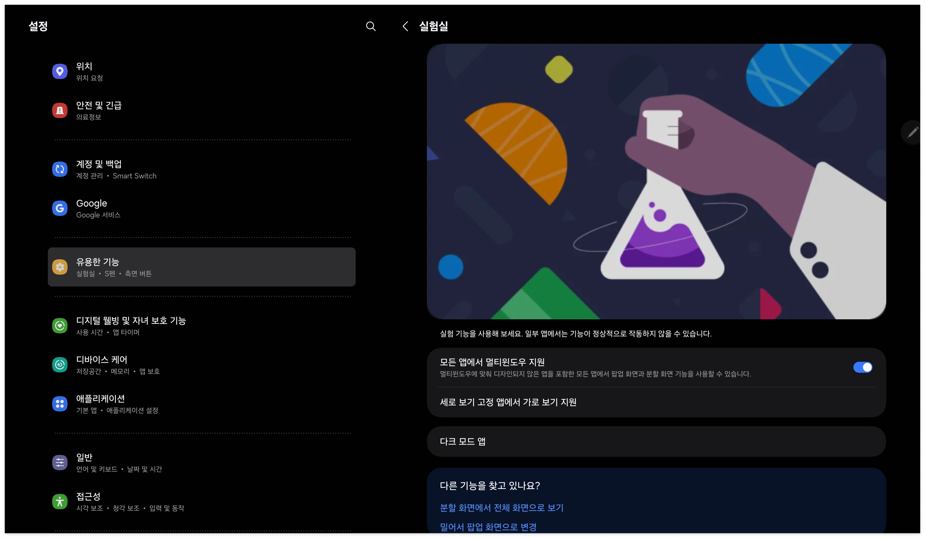먼저 설정에서 "유용한 기능" 탭에 들어갑니다 이후 "실험실" 버튼을 눌러줍니다