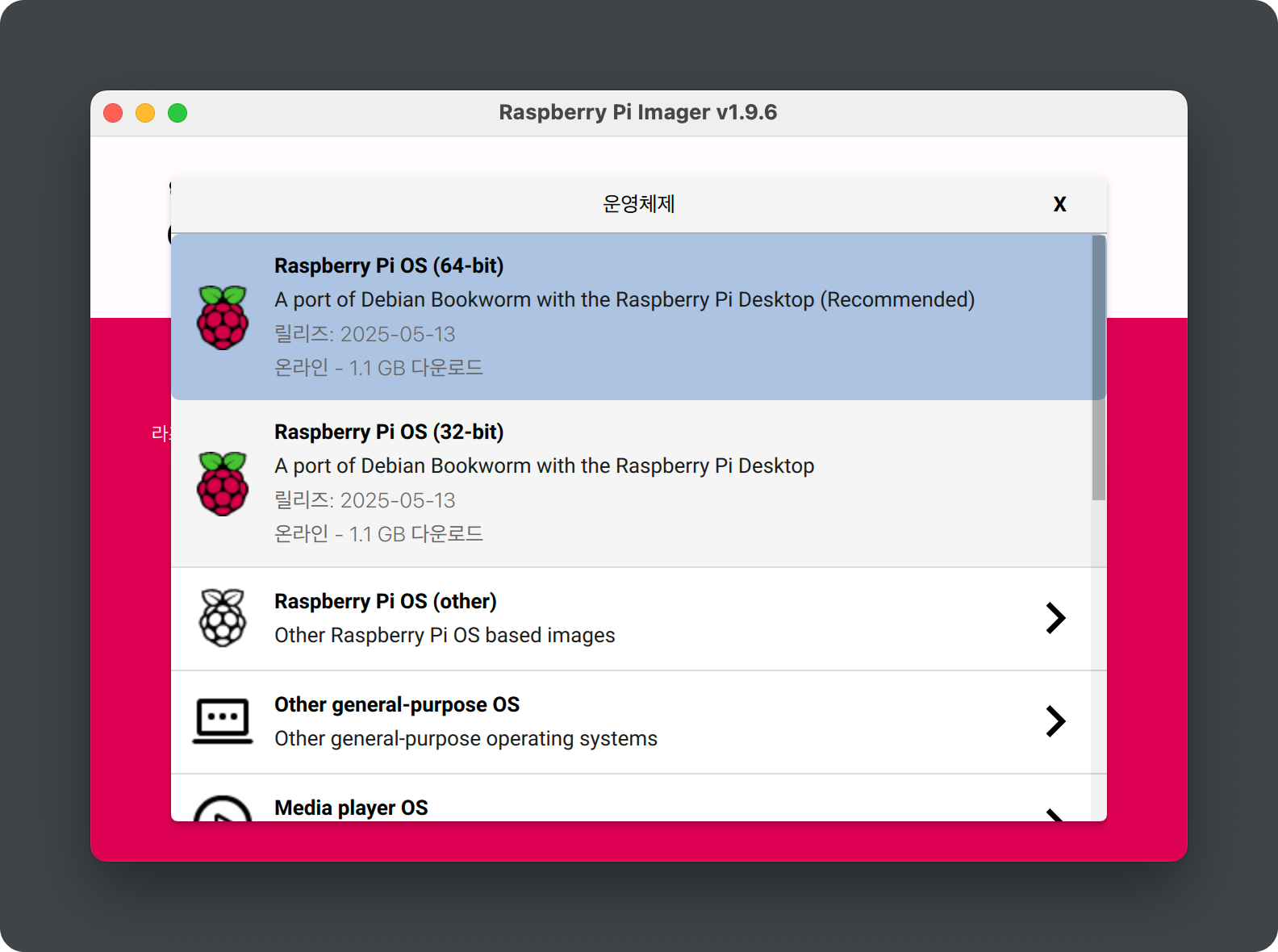 라즈베리파이 OS 64비트와 설치할 SD카드를 지정해줍니다.