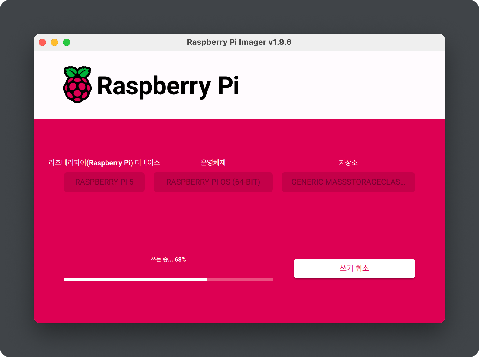 설정을 완료했다면, 쓰기 시작을 눌러 SD카드에 라즈베리파이 OS 설치를 시작합니다